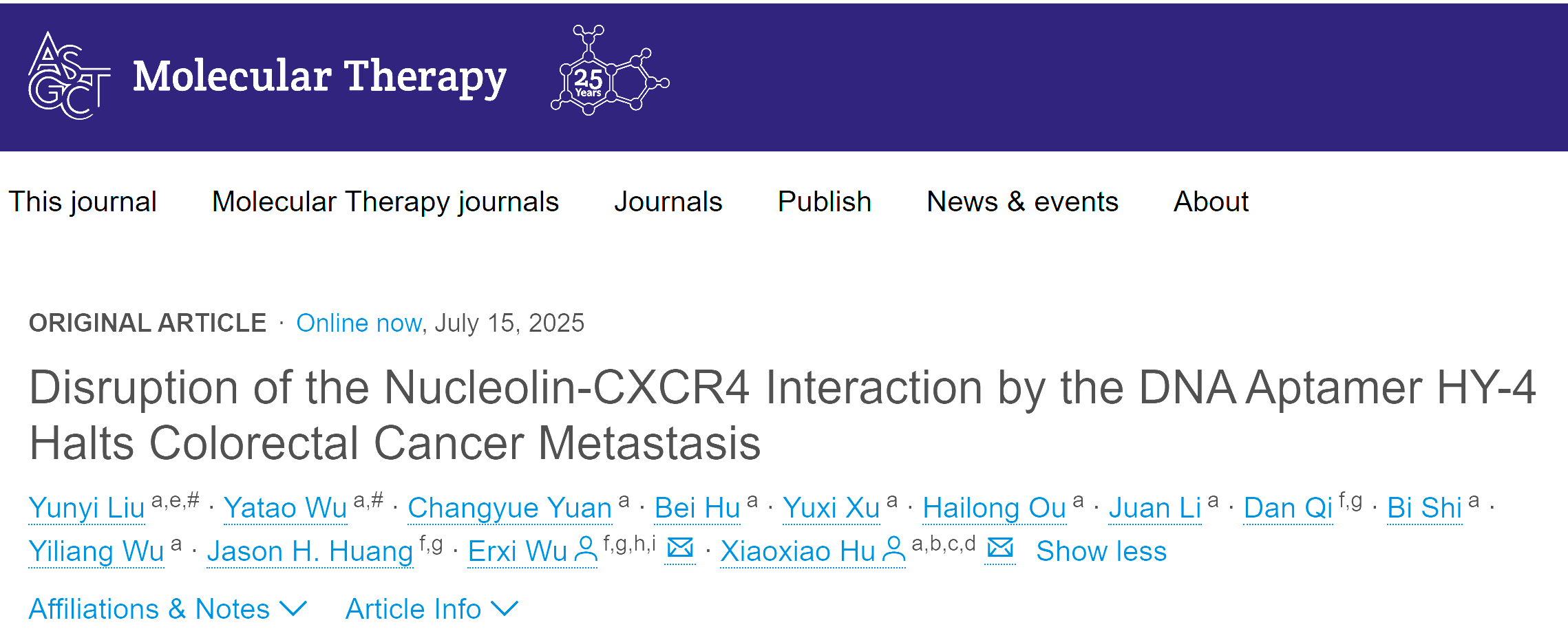 2025年7月16日,beat365亚洲体育在线官网胡小晓课题组在CellPress出版的医学领域权威期刊Molecular Therapy上在线发表了题为“Disruption of Nucleolin-CXCR4 Interaction by DNA Aptamer HY-4 Halts Colorectal Cancer Metastasis”的研究论文。在该研究中,研究者通过X-aptamer技术增强和扩展了SWAN文库,并鉴定了一种特异性靶向结直肠癌的新核酸适体HY-4。通过人结肠直肠癌异种移植裸鼠模型靶向实验证明了HY-4能在活体水平特异性靶向结直肠癌细胞。进一步通过拉下实验和MS/LC蛋白质组学质谱测序分析确定其分子靶标为核仁素蛋白(Nucleolin、NCL),并在Tranwell迁移和侵袭实验验证了HY-4对结直肠癌细胞转移的抑制效果。